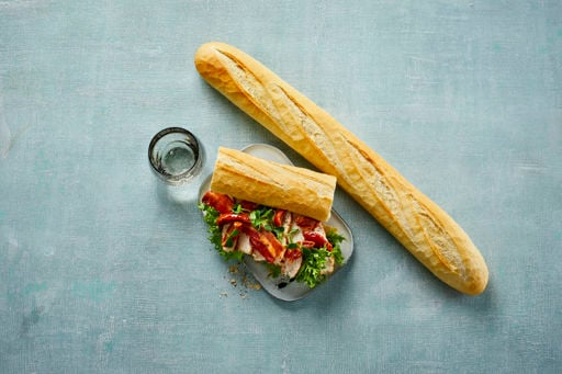 Classic baguette in the French tradition with a crisp crust and silky soft crumb made of wheat flour, water, yeast and salt. One carton contains 1 bag with 18 pieces in each bag.