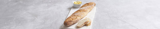 A premium quality, rustic stone baked ciabatta bread with a light, crisp golden crust, authentic floured appearance, and soft, open textured centre in a traditional baguette shape. The perfect premium ciabatta bread carrier or loaf for a café, coffee shop, restaurant, hotel or contract caterer.