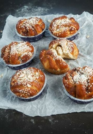 WHEAT flour, water, sugar, vegetable oil (rapeseed), ALMOND 3,5%, BUTTER 3,4%, yeast, cinnamon, WHEAT GLUTEN, MILK powder, salt, cardamom, inverted sugar syrup, EGG powder, WHEAT sourdough (water, fermented WHEAT flour), emulsifier (E472e), enzymes, natural flavour (vanilla), flour treatment agent (E300).