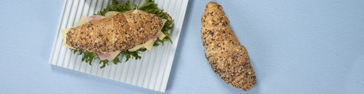 flour (WHEAT 55%, RYE 13%), curd cheese lean (MILK) 9%, linseed, water, yeast, sunflower seeds, rapeseed oil, salt, SESAME seeds, blue poppy seeds, OAT flakes, BARLEY malt extract (BARLEY malt, water), roasted WHEAT malt flour, flour treatment agent: ascorbic acid