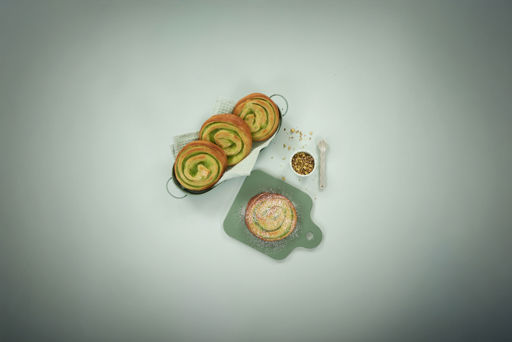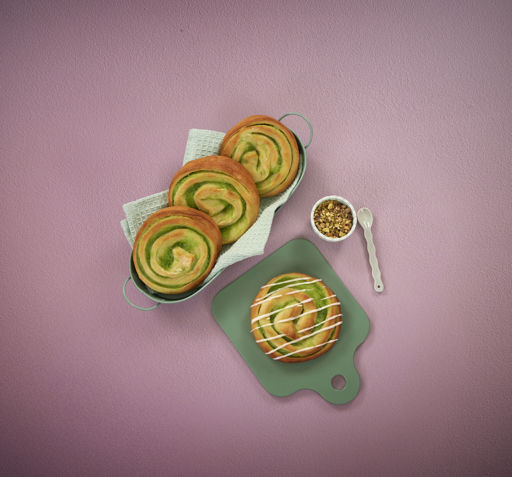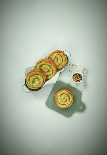 Dough (WHEAT flour, water, vegetable oils - palm and rapeseed, sugar, yeast, whole MILK powder, WHEAT gluten, iodised salt, emulsifiers E472e, E471and E322, dextrose, skimmed MILK powder, acidity regulator E330, flavouring, flavouring vanillin, antioxidant E300, salt), pistachio flavoured filling 30 % (sugar, water, modified starches, rapeseed oil, potato granules, glucose syrup, apricot kernels, WHEAT flour, emulsifier E471, salt, flavourings, preservative E202, colours E160a and E142). May contain EGGS, SOYA, SESAME, ALMONDS, MUSTARD products.