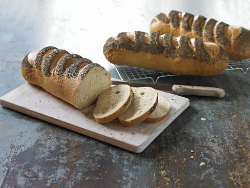 Classic Danish white bread made from wheat flour and sourdough and sprinkled with blue poppy seeds. The bread is baked in a stone oven, but the recipe is composite so that the bread retains its classic characteristics of a thin, crisp crust and a dense, soft crumb.