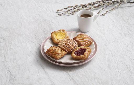 MINI RASPBERRY CROWN: DOUGH: WHEAT Flour (with Calcium, Iron, Niacin, Thiamin), Vegetable Margarine (Palm Oil, Rapeseed Oil, Water, Emulsifier (E471), Salt, Acidity Regulator (E330), Flavouring), Water, Yeast, Egg (EGG, Salt), Sugar, Improver (WHEAT Flour). FILLING: Raspberry & Strawberry Filling (28.0%) (Sugar, Raspberries, Water, Strawberry Puree, Maize Starch, Gelling Agent (E406), Elderberry Juice Concentrate, Flavouring, Acidity Regulator (E331iii), Preservative (E202)), Sugar, Vegetable Margarine (Palm Oil, Rapeseed Oil, Water, Coconut Oil, Salt, Emulsifier (E471), Acidity Regulator (E330), Flavouring), Water, WHEAT Flour, ALMOND Powder, Flavouring. TOPPING: Glaze (Water, Glazing Agent (E953), Sugar, Gelling Agent (E406), Acidity Regulator (E330), Preservative (E202)).