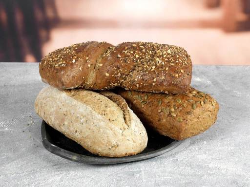 Pumpkin seed bread 650 g: WHEAT flour, water, wholemeal RYE flour (10.1%), RYE sourdough, pumpkin seed (9%), sunflower seed, WHEAT gluten, brown flaxseed, RYE flour, malted WHEAT flakes, salt, sugar, malted BARLEY, yeast, flour treatment agent (E300), dried WHEAT sourdough, honey, emulsifier (E471, E472e), cumin, flavor. May contain traces of milk, soy, almond, sesame seed.Nutrition/100 g: Energy 1154/282 kJ/kcal; Fat 8,6 g; of which Saturates 1,4 g; Carbohydrates 35,9 g; of which Sugars 2,6 g; Nutritional fiber 5,4 g; Protein 12,3 g; Salt 1,1 g.