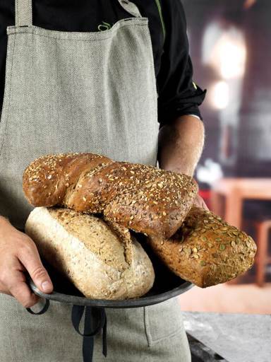 Alpbread twisted 650 g: WHEAT flour, water, wholemeal WHEAT flour (7.8%), WHEAT sourdough, wholemeal RYE flour (4.2%), ground WHEAT flakes, OATMEAL (2.8%), brown flaxseed, vegetable oil (rapeseed), WHEAT gluten, flaxseed, salt, malted BARLEY, SESAME SEED, millet, sunflower seed, buckwheat, yeast, flour treatment agent (E300). May contain traces of milk, soy, almond.Nutrition/100 g: Energy 1077/259 kJ/kcal; Fat 5,7 g; of which Saturates 0,6 g; Carbohydrates 39 g; of which Sugars 1,4 g; Nutritional fiber 5 g; Protein 9,9 g; Salt 0,9 g.