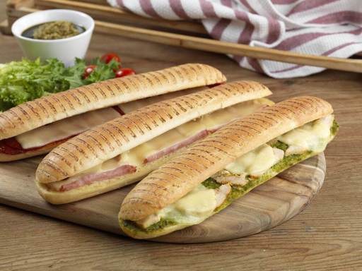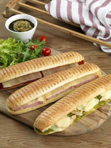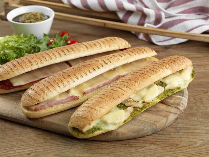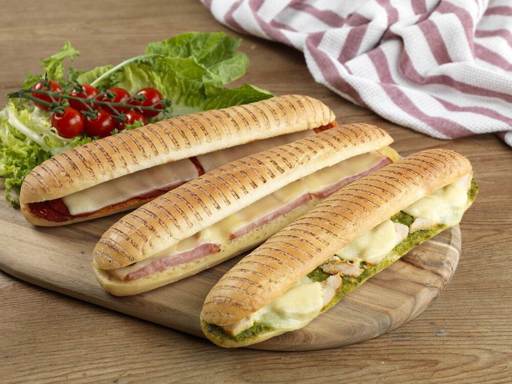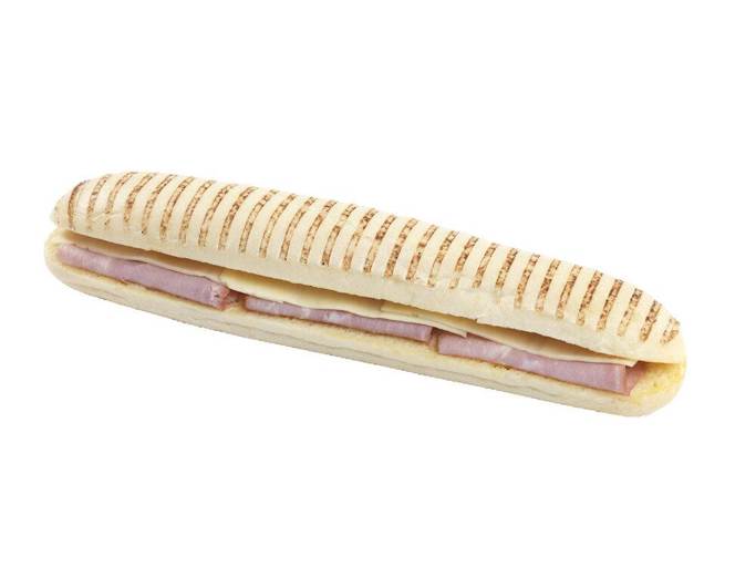 Bun (WHEAT flour, water, yeast, salt, olive oil, WHEAT gluten, malted WHEAT flour, enzymes, flour treatment agent E300), hot smoked ham 15 % (pork ham (83 %), water, salt, stabilisers E451 and E407a, pork protein, sugar, yeast extract, antioxidants E316 and E330, flavouring, smoke flavouring, thickener E415, spices and their extracts, preservatives E250 and E262, acidity regulator E334), CHEESE "Gouda" 15 %, mayonnaise with sugar and sweetener (rapeseed oil, water, spirit vinegar, starch, EGG yolk, sugar, salt, MUSTARD seed, WHEAT starch, spices, thickener E412 and E401, acidity regulators E330 and E296, flavouring, colour E160a, sweetener E954), mustard with sugar and sweetener (water, rapeseed oil, MUSTARD powder, acidity regulators E260, E330, E300 and E296, salt, EGG yolk powder, thickeners E412 and E415, MILK powder, colour E161b, sweetener E954, preservative E211, flavouring). May contain traces of soya, celery, sesame and fish products.
