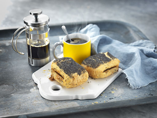 WHEAT flour, water, margarine (palm-, rapeseed and coconut oil, water, emulsifier (vegetable E471), salt, acidity regulator (E330), natural flavouring substance and natural flavouring, vitamin A), sugar, almond mass (ALMONDS, sugar, water), poppy seeds 2%, yeast, pasteurized EGG, modified starch, salt, stabilizer (E440), WHEAT malt flour, flour treatment agent (E300, alpha-amylase, xylanase, transglutaminase). May contain traces of sesame seeds, pecan- and hazelnuts.