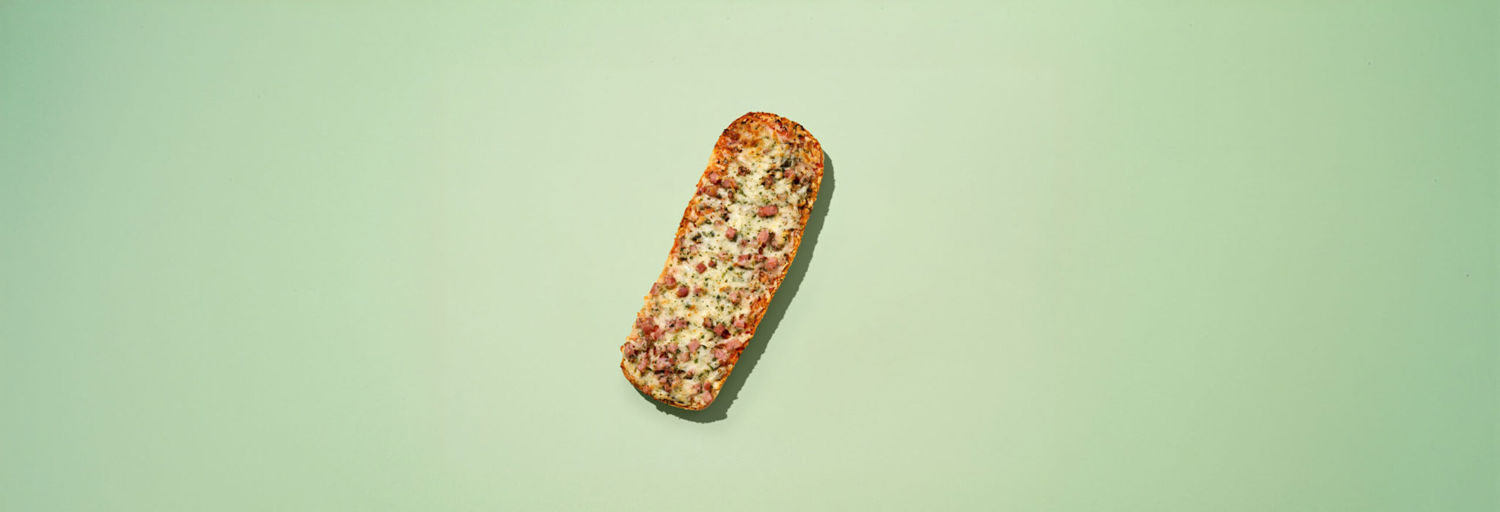 A sliced ciabatta roll, topped with tomatoes sauce, cheese, ham and herbs. The pizza ciabatta has a length of 22 cm and a weight of 170 grams.
