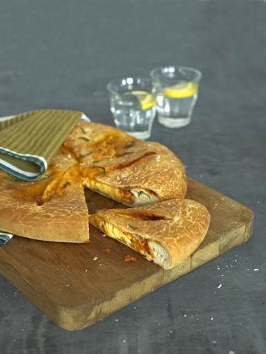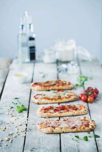 WHEAT flour, water, mozzarella 14,5% (MILK, salt, rennet, lactic acid bacteria, acidity regulator: E330 citric acid), cooked ham 10% (meat pork, sugar, salt, modified potatoes starch,antioxidant: E301 sodium ascorbate, preservative: E250 sodium nitrite), tomato puree 4,5%, durum WHEAT semolina, olive oil, sunflower seeds oil, tomato pulp 2,3%, salt, brewer's yeast, malted WHEAT flour, sugar, oregano. May contain traces of egg.