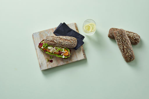 WHEAT flour, water, coarse RYE flour 10%, flinseeds 6%, sunflower seeds 5%, RYE flakes 5%, BARLEY malt extract, WHEAT gluten, dried sourdough (WHEAT flour, sourdough culture), salt added iodine, sugar, SESAMESEEDS 1%, blue poppy seeds 1%, millet seeds 1 %, yeast, thickening agent (E412), emulsifier (vegetable E472e), dextroser, BARLEY malt flour, WHEAT malt flour, flour treatment agent (E300), enzymes (WHEAT). May contain traces of milk.