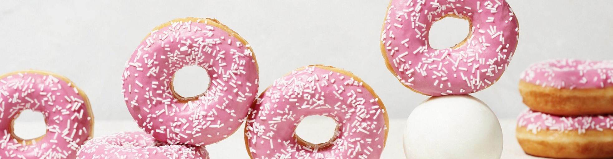 Classic american donut decorated with strawberry glazing. Thaw and serve.