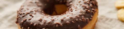 A classic chocolate doughnut. Finished with a topping of chocolate glaze and pieces of chocolate. The doughnut has a diameter of 9 cm and a weight of 58 grams.